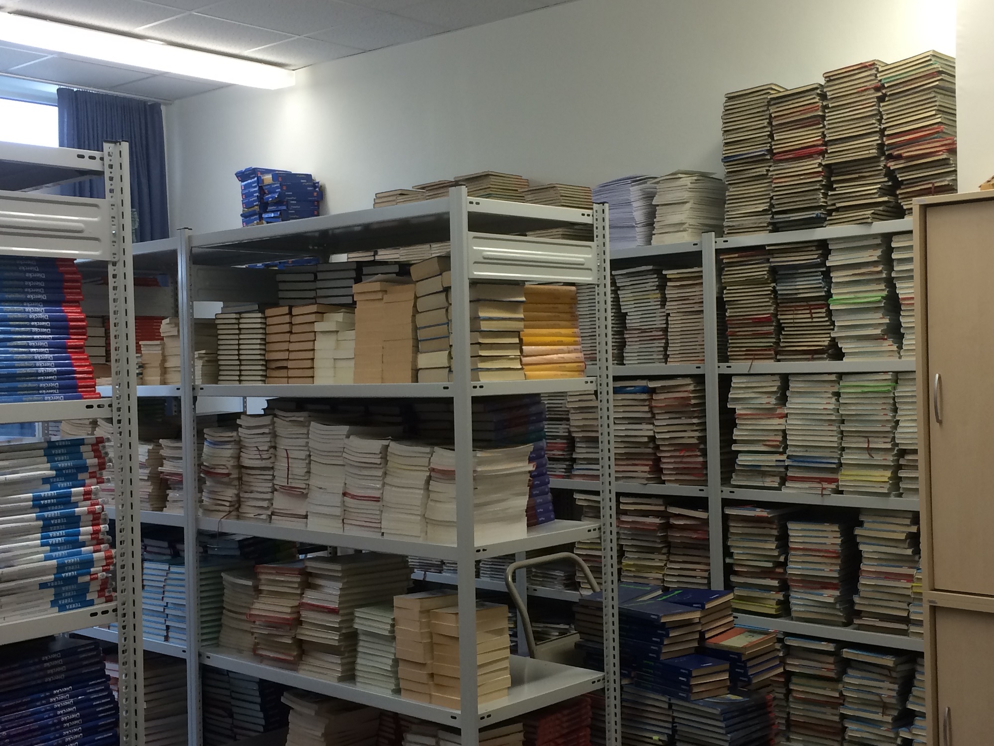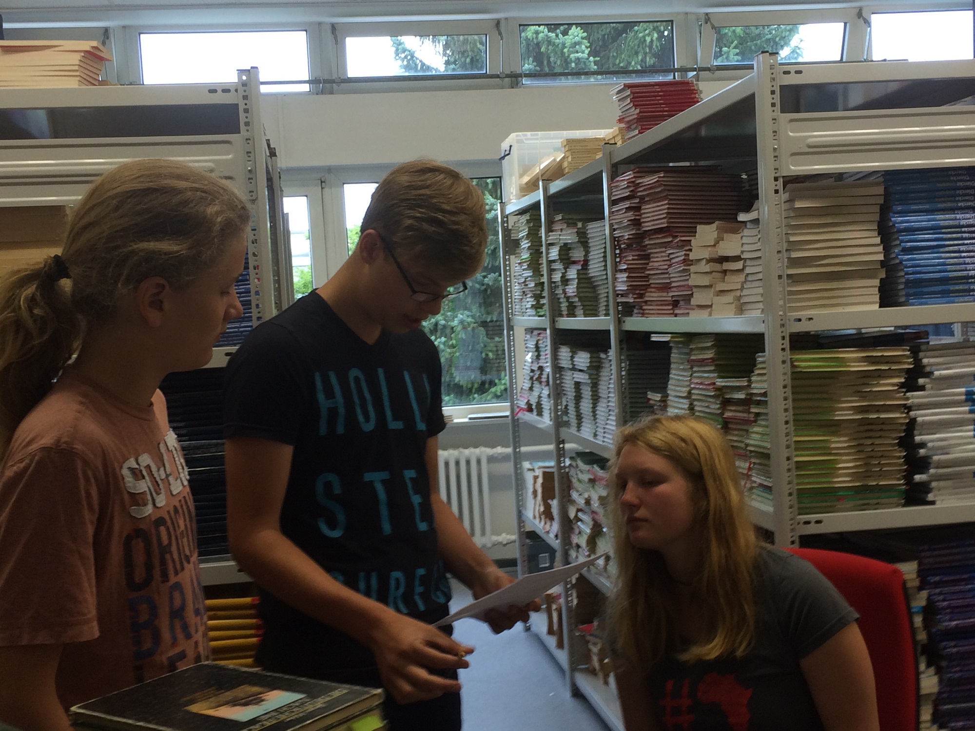 Zum Ende des Schuljahres gibt es immer sehr viel Arbeit in der Lernmittelbücherei. Bücher müssen aus den Klassen geräumt werden und auf ihren Zustand hin kontrolliert werden. Es muss entschieden werden, ob sie weiterverwendet werden oder aussortiert werden müssen.